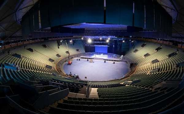 If you close your eyes and open them again, the black spaces, wide and empty, suddenly show something new: a sacristy, a press area, a chapel, a room for volunteers... In a few hours, Vistalegre will open its doors and offer all those attending a place to celebrate Guadalupe's holy life.