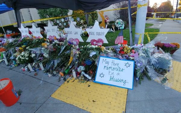 In the following days, though the streets were closed, many people brought flowers, creating a memorial for the victims at the synagogue. Anyone who comes is obviously praying; no one is talking, and it is quite solemn. People stop by 24/7 bringing flowers.