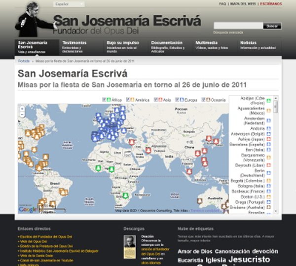 www.sanjosemaria.info ofrece un mapa de Google con algunas de las principales misas que se celebrarán en torno al 26 de junio, fiesta del fundador del Opus Dei.