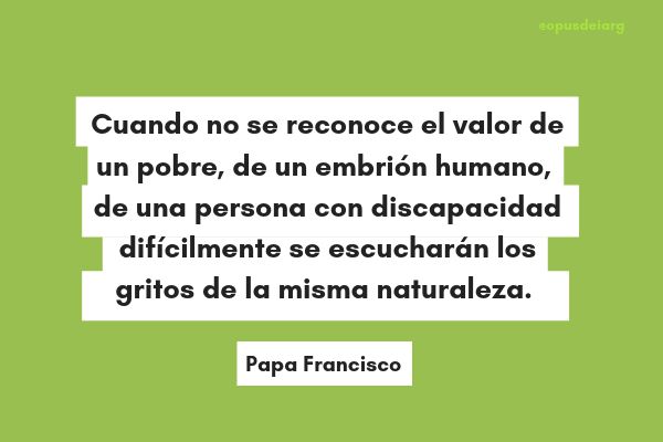 7. “Cuando no se reconoce en la realidad misma el valor de un pobre, de un embrión humano, de una persona con discapacidad –por poner sólo algunos ejemplos–, difícilmente se escucharán los gritos de la misma naturaleza. Todo está conectado”. (Punto 117)