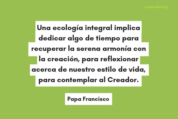 10. “La naturaleza está llena de palabras de amor, pero ¿cómo podremos escucharlas en medio del ruido constante, de la distracción permanente y ansiosa, o del culto a la apariencia? Una ecología integral implica dedicar algo de tiempo para recuperar la serena armonía con la creación, para reflexionar acerca de nuestro estilo de vida y nuestros ideales, para contemplar al Creador, que vive entre nosotros y en lo que nos rodea, cuya presencia «no debe ser fabricada sino descubierta, develada”. (Punto 255)