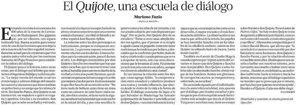 El mundo recordará esta semana los 400 años de la muerte de Cervantes y de Shakespeare. Dos gigantes que, por ser clásicos, nos siguen hablando hoy. Buena ocasión para tomar nota de una de las lecciones que nos deja la obra maestra del escritor español, tremendamente actual para la coyuntura que vive nuestro país y reforzada por las continuas llamadas del Papa Francisco para establecer la cultura del diálogo.