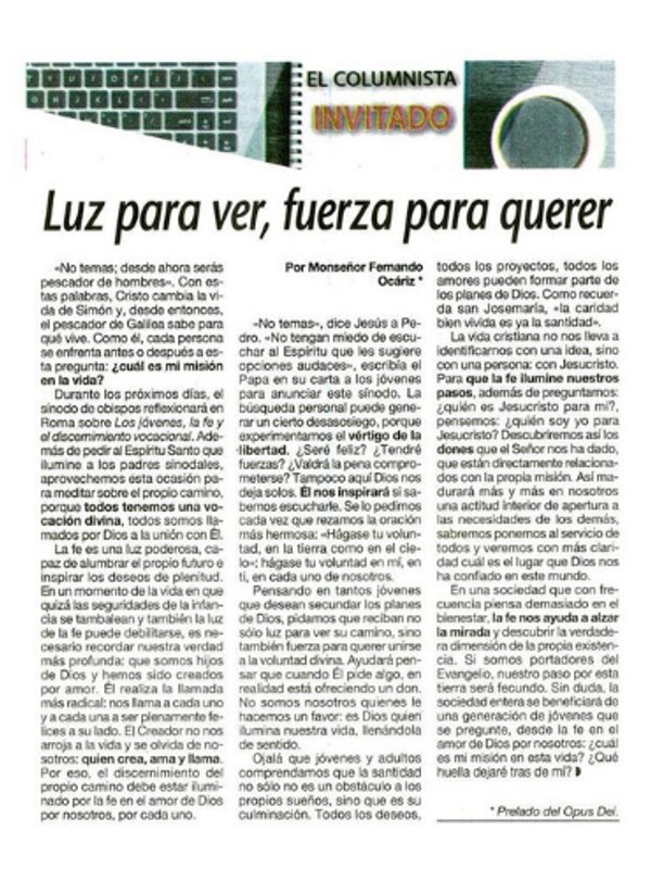 Durante los próximos días, el sínodo de obispos reflexionará en Roma sobre Los jóvenes, la fe y el discernimiento vocacional. Además de pedir al Espíritu Santo que ilumine a los padres sinodales, aprovechemos esta ocasión para meditar sobre el propio camino, porque todos tenemos una vocación divina, todos somos llamados por Dios a la unión con Él.