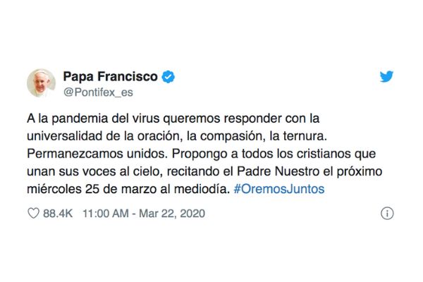 - En estos días comienzan a verse otras consecuencias de la pandemia, como el hambre. Ya empezamos a ver el “después”. #OremosJuntos por las familias que padecen necesidad y sufren hambre a causa de la pandemia (28 de marzo).