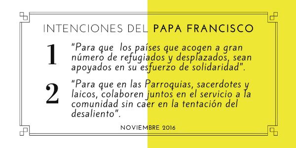 La intención universal del apostolado de la oración del Santo Padre para el mes de noviembre de 2016 es: “Para que los países que acogen a gran número de refugiados y desplazados, sean apoyados en su esfuerzo de solidaridad”.