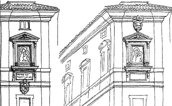 Después de varias semanas, y tras varias visitas a la plaza para encontrar alternativas, presenté a monseñor Del Portillo una posible solución, con sus correspondientes fotomontajes y dibujos: sustituir una ventana en el chaflán del edificio que hay entre el Cortile de San Dámaso y la plaza, por un mosaico de la Virgen [1].