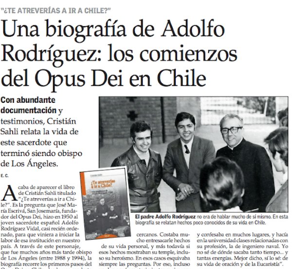 Acaba de aparecer el libro de Cristián Sahli titulado "¿Te atreverías a ir a Chile?". Es la pregunta que José María Escrivá, San Josemaría, fundador del Opus Dei, hizo en 1950 al joven sacerdote español Adolfo Rodríguez Vidal, casi recién ordenado, para que viniera a iniciar la labor de esa institución en nuestro país. A través de este personaje, que fue muchos años más tarde obispo de Los Ángeles (entre 1988 y 1994), la biografía recorre los primeros pasos del Opus Dei en Chile, desde una modesta residencia de estudiantes.
