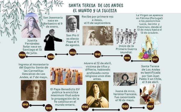 Juanita Fernández Solar fue una sencilla joven chilena, alegre y deportista, que tomó el nombre de Teresa de Jesús al ingresar al convento de carmelitas descalzas. Había nacido en Santiago el 13 de julio del año 1900 y a los 14 años experimentó la llamada a servir a la Iglesia a través de la oración contemplativa en la vida monástica. A los 17 años expuso su ideal de "sufrir y orar" y, con 18 años, ingresó al monasterio de carmelitas descalzas en Los Andes, porque su pobreza le habló al corazón. Le ilusionaba saber que su oración y sacrificio servirían para mejorar y purificar al mundo, y como mujer enamorada solía decir: "Cristo, ese loco de amor, me ha vuelto loca".
