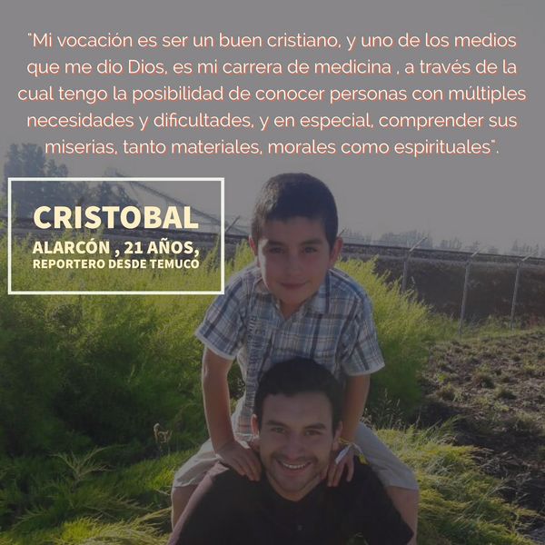 "Me llamo Cristóbal, vivo en Temuco, tengo 21 años, 2 hermanos, yo soy el hermano mayor. En Temuco vivo con Rocío mi hermana y mi hermano Joaquín, vive con mis padres en Mininco. Mis 4 abuelos están vivos y son un pilar fundamental en mi vida. Soy universitario, pasé a cuarto de Medicina en la Universidad de la Frontera que es la universidad estatal de la Araucanía, región más pobre de Chile. Mi vocación, es ser un buen cristiano, y uno de los medios que me dio Dios, es mi carrera, a través de la cual tengo la posibilidad de conocer personas con múltiples necesidades y dificultades, y en especial, comprender sus miserias, tanto materiales, morales como espirituales. Lo importante no es solo conocerlas sino intentar ayudar a los pacientes (del Hospital Regional donde hacemos nuestras prácticas). Y tal como nos dice el Papa, es hermoso experimentar esa alegría por compartir la fe, consolar corazones afligidos y dar esperanza a quién Dios puso al frente tuyo. El contexto de mi región marca mi formación, ya que me permite ver y entender mejor la opción preferencial de Jesús por los pobres, y esto, hace que mis metas sean distintas, que no solo me interese ser un profesional muy calificado (como por supuesto quiero serlo) sino ser un profesional integral, preocupado del paciente con la dignidad que se merece por ser persona y no ver solo la enfermedad que tengo que tratar" .