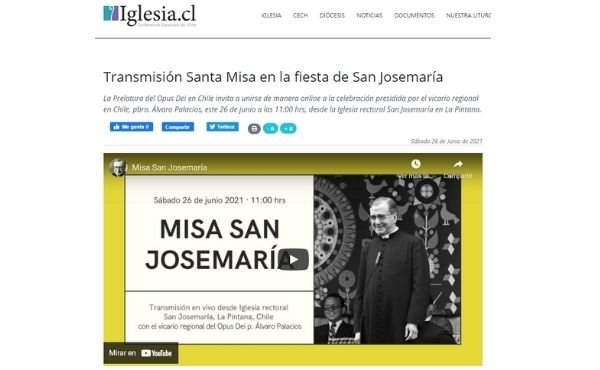 El sitio web de la Iglesia en Chile invitó a unirse a la misa en la fiesta de San Josemaría el 26 de junio 2021, que celebró el vicario regional en Chile, pbro. Álvaro Palacios y que se transmitió desde la Iglesia rectoral San Josemaría en La Pintana.