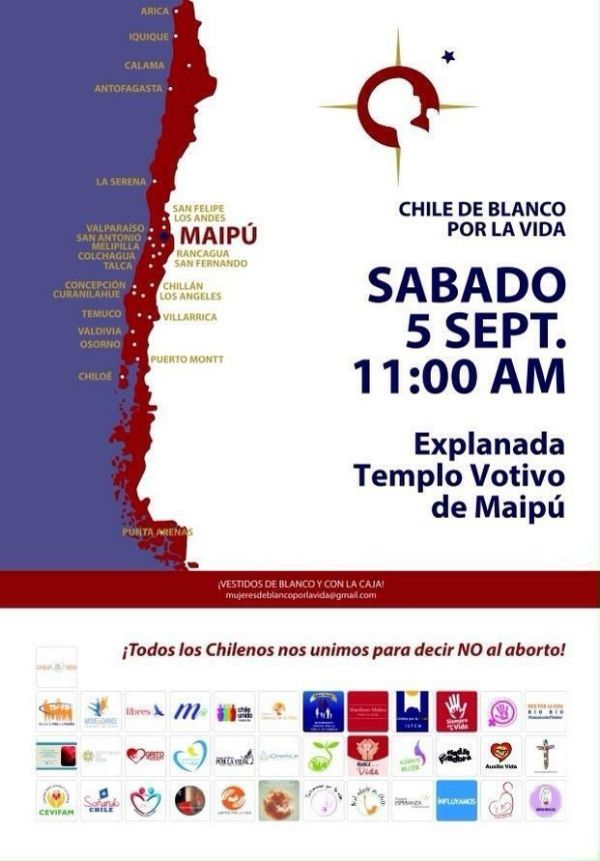 Este sábado 5 de septiembre, organizaciones chilenas pro vida han organizado una manifestación pacífica a las 11:00 horas en 33 ciudades de Chile. Más de 40 referentes participarán desde Arica a Punta Arenas en una manifestación que consistirá en familias vestidas de blanco. “Es un acto de paz y por la vida, sin pancartas, en silencio”, comenta María Paz Vial, responsable de la agrupación Mujeres de Blanco, a cargo de la actividad.