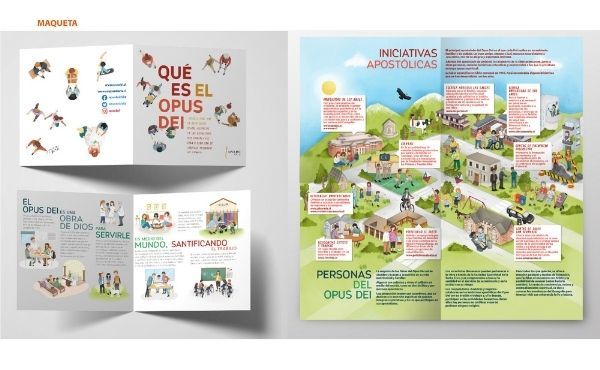 En el folleto se muestran diferentes obras corporativas y labores personales del Opus Dei junto a una breve descripción. Para conocer más sobre cada una de ellas puedes abrir el PDF e ingresar a los links que ahí aparecen.