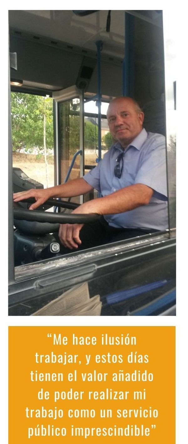 Tino tiene 60 años, y sale cada día a conducir uno de los autobuses públicos que circulan por Valladolid. Entre las tres de la tarde y las once de la noche recorre siempre la misma ruta, pero estos días lo hace con una sensación especial. “Me hace ilusión trabajar, y estos días tienen el valor añadido de poder realizar mi trabajo como un servicio público imprescindible”.