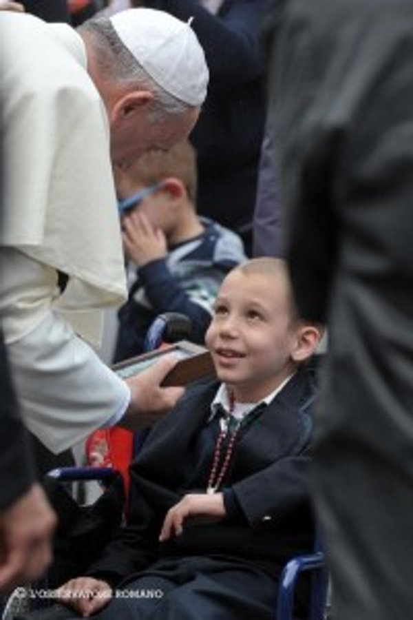 Queridas familias, ustedes lo saben bien: la verdadera alegría que se disfruta en familia no es algo superficial, no viene de las cosas, de las circunstancias favorables… la verdadera alegría viene de la armonía profunda entre las personas, que todos experimentan en su corazón y que nos hace sentir la belleza de estar juntos, de sostenerse mutuamente en el camino de la vida. En el fondo de este sentimiento de alegría profunda está la presencia de Dios, la presencia de Dios en la familia, está su amor acogedor, misericordioso, respetuoso hacia todos. Y sobre todo, un amor paciente: la paciencia es una virtud de Dios y nos enseña, en familia, a tener este amor paciente, el uno por el otro. Tener paciencia entre nosotros. Amor paciente. Sólo Dios sabe crear la armonía de las diferencias. Si falta el amor de Dios, también la familia pierde la armonía, prevalecen los individualismos, y se apaga la alegría. Por el contrario, la familia que vive la alegría de la fe la comunica espontáneamente, es sal de la tierra y luz del mundo, es levadura para toda la sociedad.