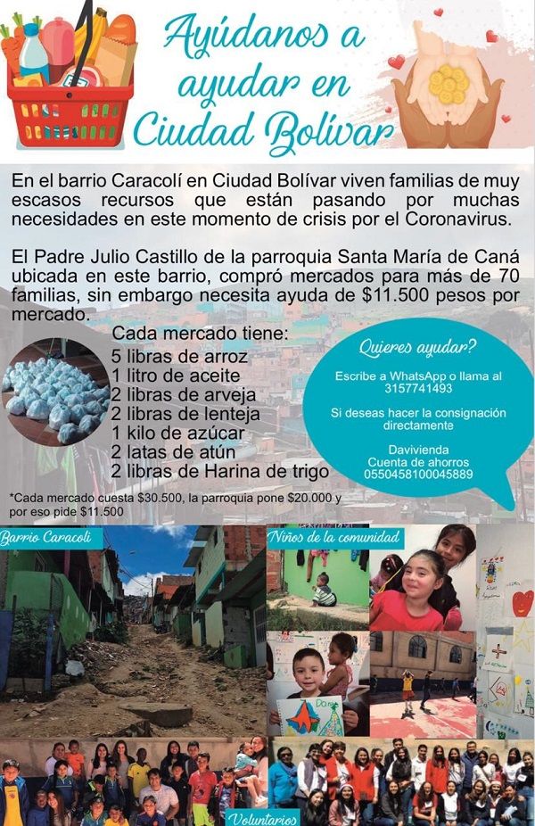 El dinero recogido se consigna al Banco de Alimentos de Bogotá que hace llegar los mercados a la Parroquia y el sacerdote, con sus colaboradores, los lleva a las familias más necesitadas. En la primera semana pudo entregar 70 mercados, luego fueron 130 y deseamos continuar con esta campaña mientras dure la crisis por el Covid-19.