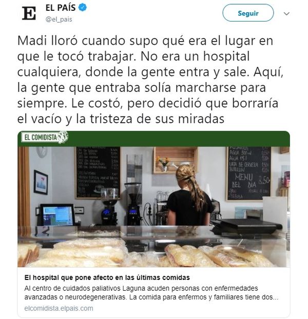 Según las estimaciones que hace la Sociedad Española de Cuidados Paliativos (Secpal), unas 100.000 personas necesitarían, al año, esos cuidados más específicos. Pero solo la mitad de ellas los reciben. "Hay una tremenda escasez de equipos específicos de cuidados paliativos en nuestro sistema de salud. Escasez y distribución irregular", denuncia Alberto Meléndez, vicepresidente de Secpal. Y, desde luego, un café con canela y espuma o un pincho de tortilla no van a aliviar esa situación. Pero, bien acompañados, pueden ayudar a sobrellevar esos últimos días, o meses, de muchos de estos pacientes y también el día a día de sus familiares.