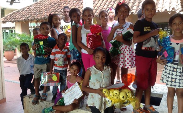 Para el día de la premiación contaron con la generosidad de la gente del pueblo: el chofer del transporte no cobró por llevarlos a Bonga, donde se llevó a cabo la ceremonia; el señor del helado los vendió a precio de costo; y los premios (un cuento y un juguete para cada uno) los regalaron personas de Cartagena - porque a cada niño había que darle un premio e incentivar de esta manera la ilusión por la escritura y la lectura-. Los dueños de las tiendas y misceláneas del pueblo donaron los ingredientes para los brownies, los platos desechables, los refrescos y los dulces. Los 24 participantes llegaron muy bien arregladitos: las niñas peinadas con sus trenzas y todos muy limpios, se notaba que iban con la mejor ropa que tenían. Pasaron la tarde entre la premiación, el refrigerio y luego jugando un rato por el jardín de Bonga. ¡Quedaron felices!