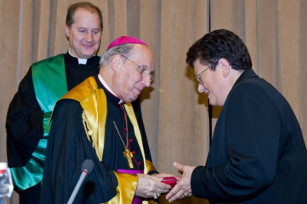Por último, querría hablar de otro hecho que, para mí y para esta Universidad, encierra un gran significado: la aprobación por parte de Su Santidad Francisco, de los decretos que abren el camino a la canonización de Juan XXIII y Juan Pablo II, y a la beatificación de Monseñor Álvaro del Portillo, mi predecesor como Prelado del Opus Dei y primer Gran Canciller de esta Universidad, tan deseada por san Josemaría. En los documentos que cuentan la historia de la Universidad de la Santa Cruz, desde su nacimiento como Centro Académico Romano hasta su constitución como Universidad Pontificia, estará siempre presente la firma de Su Santidad Juan Pablo II, que no sólo acogió la petición del Venerable Álvaro del Portillo, sino que impulsó y siguió de cerca el nacimiento de esta institución. La Providencia ha querido unir en la misma fecha la decisión del Santo Padre de canonizar y beatificar a estos dos siervos fieles de Dios y de la Iglesia, unidos en vida por una profunda cercanía espiritual. No es tampoco una casualidad que esta ceremonia se celebre en una Aula Magna dedicada a Juan Pablo II y, para quién no ha encontrado lugar aquí y sigue el acto a través del circuito de televisión interno, en el Aula Minor dedicada a Álvaro del Portillo. Más allá de la previsible alegría por poder asistir, con la gracia de Dios, a las respectivas ceremonias de canonización y beatificación el próximo año, la certeza de tener en el Cielo a estos dos seguros intercesores nos llena de gran paz y serenidad.