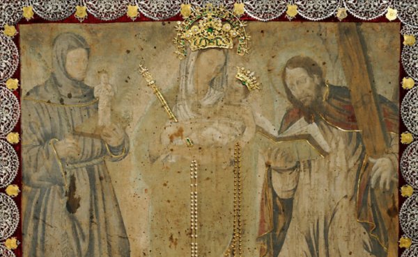 Cuenta la tradición que entre los primeros conquistadores del Nuevo Reino de Granada, Antonio de Santana, encomendero de los pueblos de Suta y Chiquinquirá, era especialmente devoto de la Virgen del Rosario. Por este motivo fabricó en el pueblo de Suta su dormitorio y pequeña capilla. Deseando poner en ella una imagen de la Madre de Dios, mandó pintar una imagen de Nuestra Señora del Rosario en una manta de algodón. Era la manta más ancha que larga y para que no quedasen en blanco los campos que quedaban a ambos lados de la Madre de Dios, mandó pintar a San Andrés Apóstol y a Santa Antonio de Padua uno a cada lado. Luego que recibió la imagen, acomodó el lienzo en un bastidor de madera y lo expuso en el altar de la capilla.