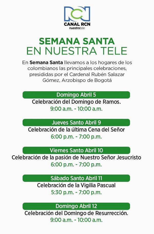 A continuación presentamos los días y horas para los oficios de la Semana Santa transmitidos por el canal RCN, empezando con este domingo de Ramos.