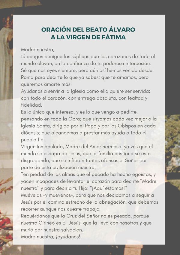 * Esta oración se recoge en el folleto de la Santa Misa en la fiesta litúrgica del Beato Álvaro, que el Prelado del Opus Dei celebrará en la basílica de San Eugenio el 12 de mayo, víspera del centenario de las apariciones de Fátima.