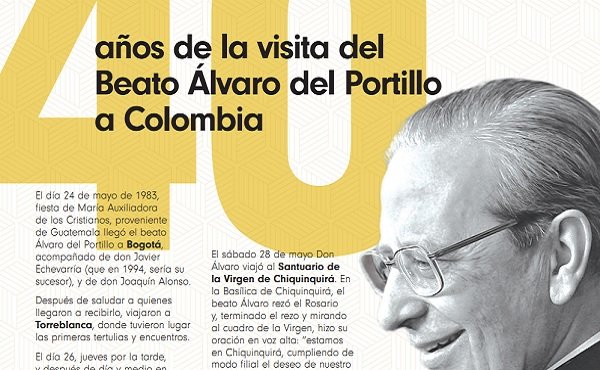 Era el 24 de mayo de 1983: hace ahora cuarenta años. Lejos en el tiempo pero siempre fresco en la memoria del corazón permanecía inalterable la gratitud por haber tenido al Fundador del Opus Dei, en Bogotá, unos minutos, el 15 de agosto de 1974. Con el dolor, suyo y nuestro, de no poder bajar del avión por disposición de los médicos. El Vicario Regional, Mons. Ugo Puccini, pudo verlo y manifestarle nuestro cariño. San Josemaría expresó su contrariedad, al tiempo que su aceptación de la Voluntad de Dios, por no haber visto a sus hijos colombianos, algo que anhelaba desde muchos años antes. Don Álvaro le acompañaba; por eso, en una tertulia en la Universidad de La Sabana, manifestó que tenía que cumplir dos deberes al visitar el país: venir a Colombia en cuanto fuese posible, para hacer lo que quiso hacer nuestro Padre y no pudo hacer y visitar Nuestra Señora de Chiquinquirá.