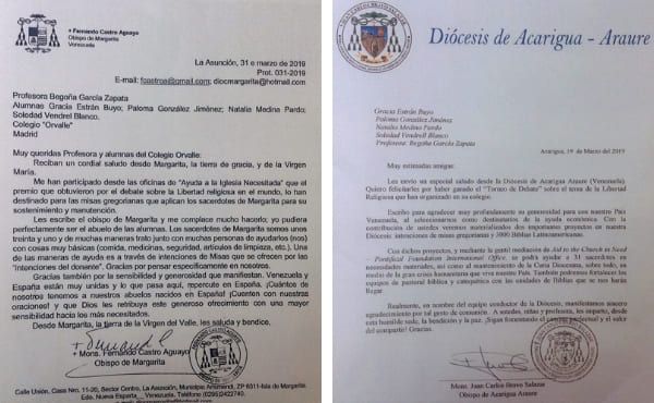 La prueba de que Venezuela estaba muy necesitada de ayuda la tuvieron las estudiantes al poco tiempo de destinar su premio a este país. Los obispos de Margarita, monseñor Fernando Castro, y de Acarigua, monseñor Juan Carlos Bravo, les enviaron sendas cartas dándoles las gracias y explicándoles lo que esto significaba para sus diócesis y sus sacerdotes.