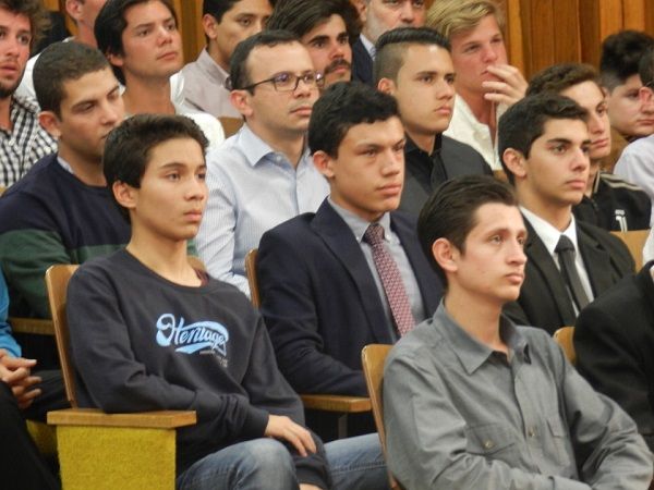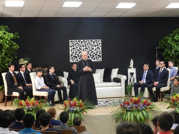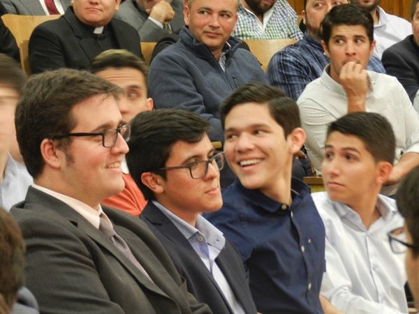 La tertulia con universitarios y muchachos de colegio inició a las 6:10 PM en el auditorio del Centro Universitario Miravalles. El ambiente era de gran expectativa. Muchos habían visto al Padre y participado en la tertulia en Panamá en el marco de a JMJ. Otros no habían estado nunca con el Padre.