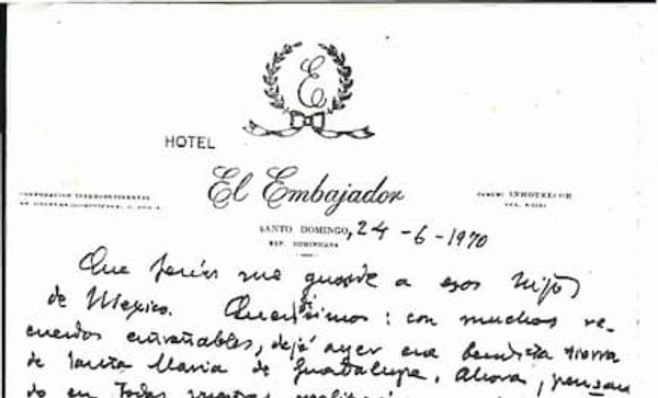Hay un sencillo documento que recoge esas horas en la isla del Caribe. Es una carta que el Padre escribió en el Hotel El Embajador, en Santo Domingo, el 24 de junio de 1970, al día siguiente de haber salido de México, en la que dice: “…con muchos recuerdos entrañables dejé ayer esa bendita tierra de Santa María de Guadalupe”. En ese mismo folio, don Álvaro del Portillo deja constancia del motivo: “...por una avería en el motor, que perdía aceite, tenemos que estar un día aquí…”.