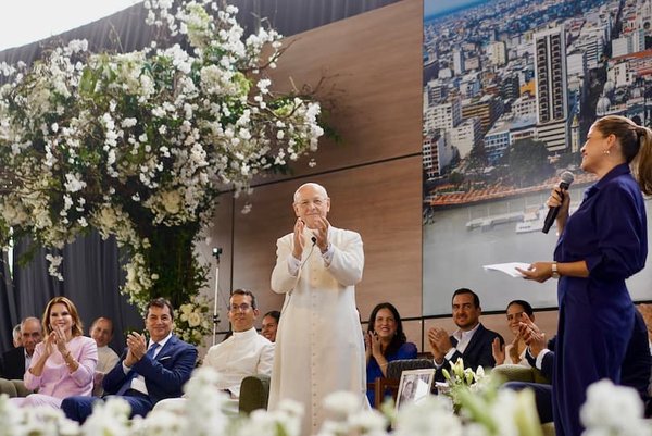 11H29. Aplausos de pie para recibir al Padre, quien pidió disculpas por su afonía (debido al cansancio del viaje y el cambio de altura en cada parada). Cuando tocó la Orquesta del Colegio Delta, él miraba a las violinistas, todos los demás lo mirábamos a él. Sobre la tarima rodeada de flores, junto con sus hijos y colaboradores de la Obra, estaba sentado en un sofá verde oliva. A la par, fotógrafos buscaban el mejor ángulo, la más audaz se colaba entre las rosas para captarlo en contrapicada.