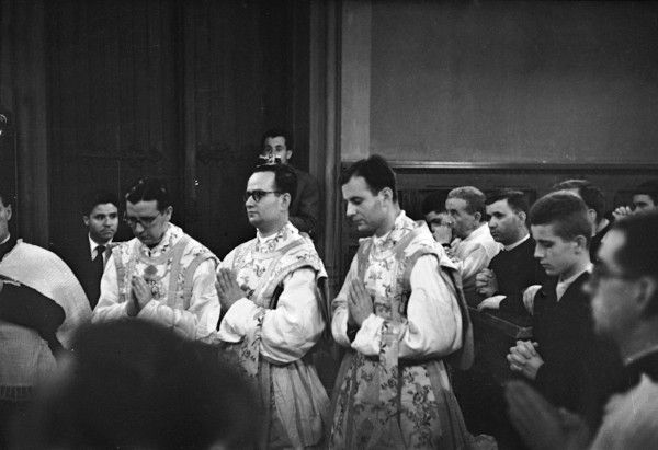 La ordenación sacerdotal de los primeros miembros del Opus Dei estaba prevista para el domingo 25 de junio. En los días previos, varias decenas de miembros de la Obra y de amigos llegaron a Madrid para asistir al acto. Era un momento muy esperado. Como dice un diario de esos días, «un poco a posteriori nos damos cuanta más perfecta de la magnitud de los acontecimientos ocurridos en este curso para la marcha de la Obra»[27]. Josemaría Escrivá de Balaguer vivió con particular emoción aquellas jornadas. La víspera de la ordenación «fue al Cementerio del Este para rezar ante la tumba de la Abuela e Isidoro. Nos ha confesado que hizo esfuerzos por contenerse, pero lloró»[28].