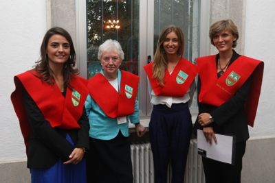 Foto1: Pilar C., Directora del Colegio Mayor; Oro Laviña, Primera Directora de Goimendi; Alejandra Vazquez, decana del Mayor y María Iraburu, Vicerrectora de Profesores de la Universidad de Navarra antes del acto de Presentación del libro de los 50 años de Goimendi que tuvo lugar en el Aula Magna del Edificio Central de la Universidad de Navarra.