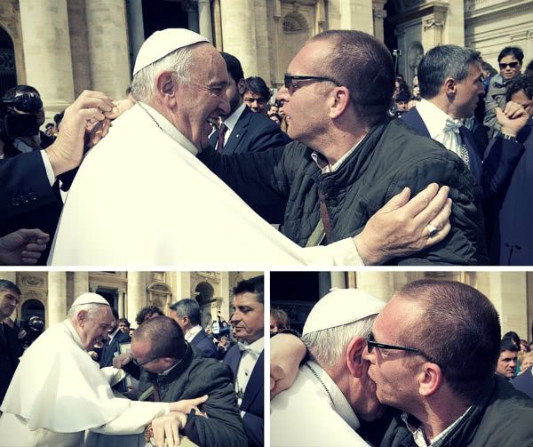 Las personas que tengo delante me abren paso. Tengo a Francisco a pocos pasos, detrás de la valla. Cuando llego a ella, casi por instinto, me arrodillo en el suelo para pedir la bendición y levanto el brazo izquierdo con el Rosario en la mano para que el Papa lo bendiga también. Me bendice, me toca la cabeza, bendice el Rosario, y luego él mismo se esfuerza por agarrarme y levantarme. Hubiera sido imposible, pero hago mi esfuerzo y, a la vez, por detrás, un ujier me agarra y me ayuda a incorporarme. Estoy de pie, frente al Romano Pontífice. La valla, por debajo del pecho, no nos impide fundirnos en un abrazo efusivo, ante la mirada de miles de personas. Una vez más se expresa la fuerza del amor del Santo Padre a los más menesterosos.