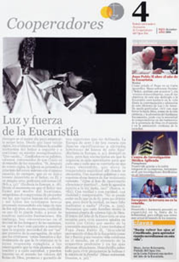 El nº 4 del boletín que edita la Asociación de Cooperadores del Opus Dei dedica su portada a la Eucaristía, por estar en el año dedicado a este Sacramento por Juan Pablo II. “Deseamos que cada hombre –se dice en la introducción- sienta la inmensa alegría de saberse hijo de Dios. El inicio del año de la Eucaristía es una ocasión para vivir nuestra misión en unión con Cristo por medio de la comunión eucarística”.