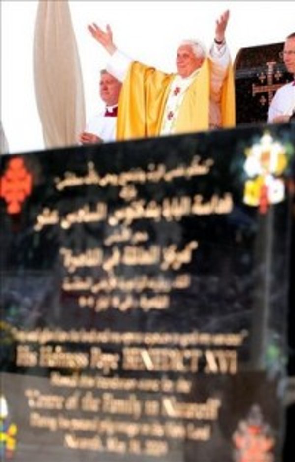 En varios momentos ha gritado el saludo de Pascua entre los árabes cristianos: -Il Masih qam (El Mesías ha resucitado) Y todos han respondido gritando: -Hakam qam (En verdad ha resucitado). Al Santo Padre se le veía disfrutar pues sonreía ante la espontaneidad del obispo y la respuesta unánime de la gente. En la homilía el Papa ha hablado de la familia. Estamos celebrando en el Patriarcado un año dedicado a la familia. Ha sido muy bonito como el Santo Padre ha puesto el modelo de la Sagrada Familia de Nazaret. Ha animado a que, siguiendo su ejemplo, se llegue a apreciar cada vez más la santidad de la familia, "que se basa en la fidelidad para toda la vida de un hombre y una mujer, consagrada en el pacto conyugal y abierta al don de la vida". También hoy ha vuelto a hablar del importante papel de la mujer, y además ha dicho palabras para los hijos, que nos vendrán muy bien para formar y alentar a los niños nuestros clubes de Nazaret y Jerusalén.