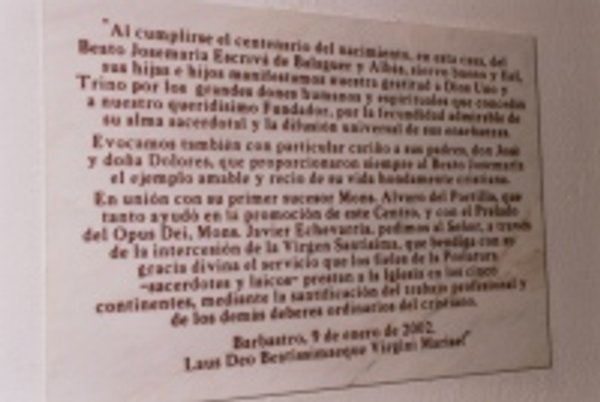 “Al cumplirse el centenario del nacimiento, en esta casa, del beato Josemaría Escrivá de Balaguer y Albás, siervo bueno y fiel, sus hijas e hijos manifestamos nuestra gratitud a Dios Uno y Trino por los grandes dones humanos y espirituales que concedió a nuestro queridísimo Fundador, por la fecundidad admirable de su alma sacerdotal y la difusión universal de sus enseñanzas. Evocamos también con particular cariño a sus padres, don José y doña Dolores, que proporcionaron siempre al beato Josemaría el ejemplo amable y recio de su vida hondamente cristiana”.
