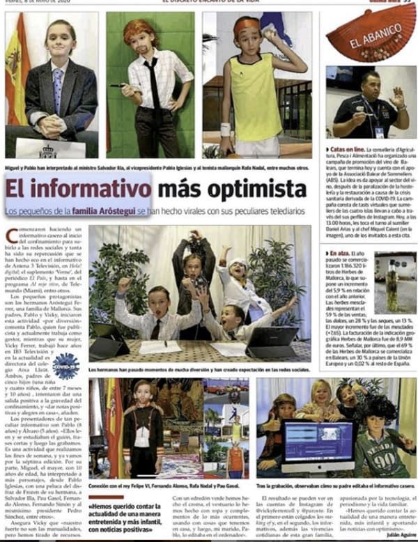 “Buenas tardes, bienvenidos a la quinta edición de las noticias de Aróstegui Televisión”. Pablo (9 años) y Álvaro (4) arrancaban así cada domingo, y tras muchas tomas falsas, el informativo de televisión en cuya producción había trabajado esa semana toda la familia, en Palma de Mallorca. Desde mediados de marzo los siete se convirtieron en presentadores, editores, productores, maquilladores e imitadores de políticos y protagonistas de la actualidad.