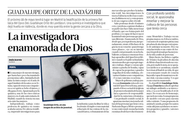 Es el perfil de Guadalupe Ortiz. El papa Francisco acaba de aprobar un milagro atribuido a su intercesión, y va a ser beatificada el 18 de mayo. No es un acto de homenaje, que no lo necesita. Es una propuesta de modelo cercano para nuestra vida corriente. Y una propuesta de amistad y ayuda, porque los santos están ahí para ayudarnos en nuestros pequeños y grandes vaivenes de la vida.
