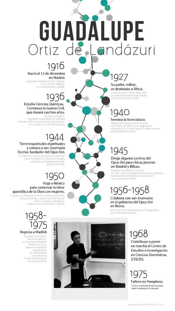 Pionera en todos los ámbitos de su vida, Guadalupe conoció al fundador del Opus Dei en 1944, con 27 años. El amor a Dios, a través del espíritu del Opus Dei, llenó por completo su corazón y su vida, y decidió pedir la admisión como numeraria. Guadalupe fue una de las primeras vocaciones femeninas que llegaron a dicha institución. Ha sido también el primer miembro laico del Opus Dei en ser beatificada el 18 de mayo del año 2019 en Madrid.