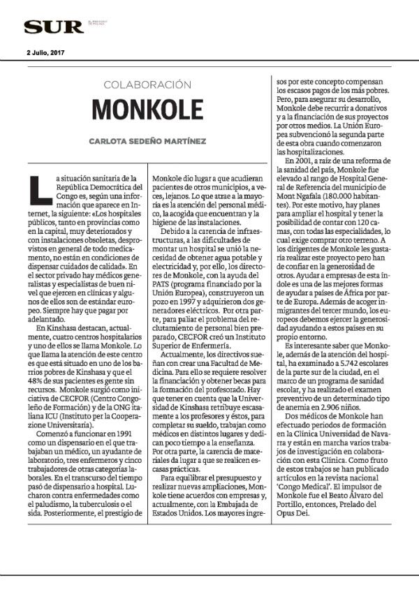 Dos médicos de Monkole han efectuado periodos de formación en la Clínica Universidad de Navarra y están en marcha varios trabajos de investigación en colaboración con esta Clínica. Como fruto de estos trabajos se han publicado artículos en la revista nacional 'Congo Medical'. El impulsor de Monkole fue el Beato Álvaro del Portillo, entonces, Prelado del Opus Dei.