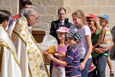 En representación de los participantes, la familia Soteras Escartín, de Zaragoza, ha iniciado los actos del día con la lectura de la Oración de las Familias, a la que ha seguido una colorida ofrenda a la Virgen: centros de flores, alimentos destinados a familias necesitadas, espárragos de Navarra, un jamón de Teruel, imágenes de Santa María, navajas gallegas, aceite y olivas de Andalucía, miel de La Alcarria, unos guantes de portero de fútbol y un brazalete de capitán, un plantón de olivo de Jaén, paños de ganchillo, piezas de cerámica granadina, embutidos de Vic (Barcelona), caramelos artesanales polacos… han sido algunos de los regalos que las familias traían para mostrar el cariño a Nuestra Señora. Grupos de niñas que van a hacer la Primera Comunión este año han ofrecido también trabajos manuales elaborados por ellas mismas. El Ayuntamiento de Secastilla, municipio al que pertenece Torreciudad, ha traído aceite, vino, uvas y repostería artesanal, mientras que la asociación RedMadre de Granada ha ofrecido una canastilla de recién nacido para el primer bebé que la necesite de la comarca del Somontano de Barbastro.