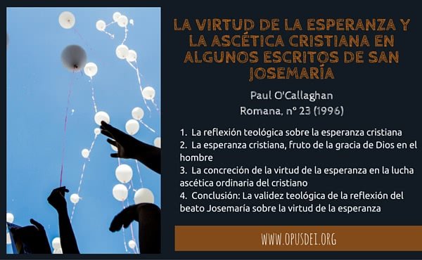 [6] Estos son algunos de los textos mas representativos: «...La esperanza en Dios enciende maravillosas hogueras de amor, con un fuego que mantiene palpitante el corazón, sin desánimos, sin decaimientos, aunque a lo largo del camino se sufra, y a veces se sufra de veras» (EC 205 a); «Aquí, en la presencia de Dios, que nos preside desde el Sagrario —¡cómo fortalece esta proximidad real de Jesús!—, vamos a meditar hoy acerca de ese suave don de Dios, la esperanza, que colma nuestras almas de alegría, spe gaudentes (Rom 12, 12), gozosos, porque —si somos fieles— nos aguarda el Amor infinito» (EC 206 a); «Don de Dios que colma el alma de alegría»...: no se trata, por tanto, de una alegría cualquiera, sino de «la luz y el calor de Dios, y la inefable alegría de la esperanza teologal» (EC 206 b). Cfr. también Camino, n. 659: «La alegría que debes tener no es esa que podríamos llamar fisiológica, de animal sano, sino otra sobrenatural, que procede de abandonar todo y abandonarte en los brazos amorosos de nuestro Padre-Dios»; «...La seguridad de sentirme —de saberme— hijo de Dios me llena de verdadera esperanza que, por ser virtud sobrenatural, al infundirse en las criaturas se acomoda a nuestra naturaleza, y es también virtud muy humana...» (EC 208 c); «Te he rogado que, en medio de las ocupaciones, procures alzar tus ojos al Cielo perseverantemente, porque la esperanza nos impulsa a agarrarnos a esa mano fuerte que Dios nos tiende sin cesar, con el fin de que no perdamos el punto de mira sobrenatural...» (EC 213 b); «Advierte la Escritura Santa que hasta el justo cae siete veces (Pro 24, 16). Siempre que he leído estas palabras, se ha estremecido mi alma con una fuerte sacudida de amor y de dolor... Una sacudida de amor, os decía. Miro mi vida y, con sinceridad, veo que no soy nada, que no valgo nada, que no tengo nada, que no puedo nada; más: ¡que soy la nada!, pero Él es el todo y, al mismo tiempo, es mío, y yo soy suyo, porque no me rechaza, porque se ha entregado por mí... Y una sacudida de dolor... Me apena de veras este comportamiento mío, pero no me quita la paz. Me postro ante Dios, y le expongo con claridad mi situación. Enseguida recibo la seguridad de su asistencia, y escucho en el fondo de mi corazón que Él me repite despacio: meus es tu!" (Is 43, 1); sabía —y sé— cómo eres, ¡adelante!» (EC 215, a-c); «...De nada sirven todas las maravillas de la tierra, todas las ambiciones colmadas, si en nuestro pecho no arde la llama de amor vivo, la luz de la santa esperanza que es un anticipo del amor interminable en nuestra definitiva Patria» (Amigos de Dios, 278 b).