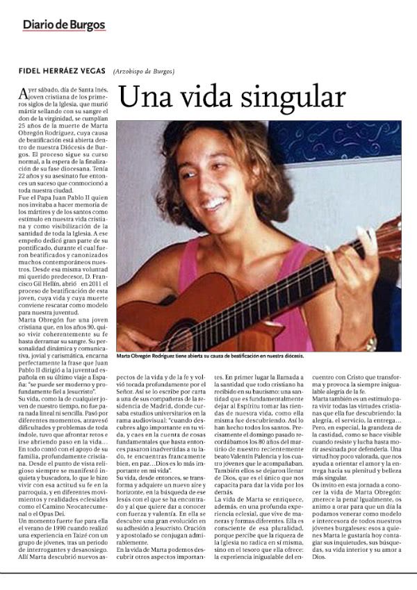 Ayer sábado, día de Santa Inés, joven cristiana de los primeros siglos de la Iglesia, que murió mártir sellando con su sangre el don de la virginidad, se cumplían 25 años de la muerte de Marta Obregón Rodríguez, cuya causa de beatificación está abierta dentro de nuestra Diócesis de Burgos. El proceso sigue su curso normal, a la espera de la finalización de su fase diocesana. Tenía 22 años y su asesinato fue entonces un suceso que conmocionó a toda nuestra ciudad.