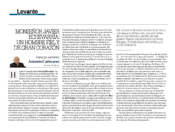 La Razón (y Levante EMV) Monseñor Javier Echevarría: un hombre fiel y de gran corazón (PDF de La Razón y PDF de Levante EMV)