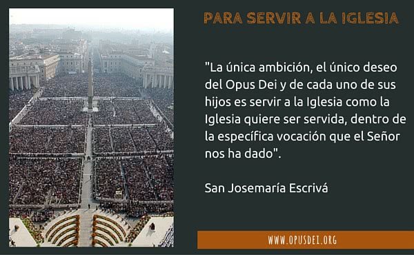 El Opus Dei nació en la Iglesia y está en la Iglesia, para servir a la Iglesia, esa es su razón de ser: se trata del servicio de una parte al todo, de un miembro a los otros miembros de un mismo cuerpo; y cada miembro sirve a los demás, primaria y esencialmente, cumpliendo su propia misión. Fuera del cuerpo no podría servir como miembro: no hay servicio al cuerpo sin comunión con los demás y con el cuerpo entero. Éste fue el espíritu de San Josemaría desde el comienzo, y así lo escribía: [10]. Hasta el mismo día de su muerte dejó dicho que ofrecía su vida –unido al Sacrificio del Altar– por la Iglesia y por el Papa.