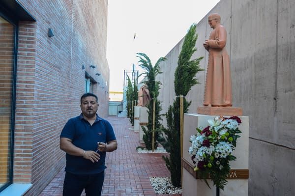 Las esculturas, de tamaño medio, son obra del artista Manuel Téllez. Cuando aún no se había levantado la planta del templo, llegó el primer encargo, el de Santa Teresa, y luego poco a poco los demás. “Se trata de una obra para exterior de un edificio que no es de estilo barroco sino más moderno y sencillo. Por eso, decidí hacerlas en barro cocido con textura, para dar continuidad al ladrillo visto, intentando reflejar lo más representativo de cada santo”. Las imágenes pueden visitarse y venerarse en el llamado patio inglés, flanqueadas por cipreses, y también desde el interior del templo, a modo de singular nave lateral. En cada ventanal puede leerse una frase alusiva a cada santo.