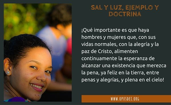 El Opus Dei es un instrumento de Dios para extender la esperanza de la Buena Nueva que Cristo ha traído. Sembrar esperanza es parte fundamental de la misión de la Iglesia y, por tanto, de nuestra misión apostólica. El Señor ha querido la Obra para que sus miembros sean, activamente, sal y luz. Dice san Josemaría: Como quiere el Maestro, tú has de ser —bien metido en este mundo, en el que nos toca vivir, y en todas las actividades de los hombres— sal y luz. —Luz, que ilumina las inteligencias y los corazones; sal, que da sabor y preserva de la corrupción.Por eso, si te falta afán apostólico, te harás insípido e inútil, defraudarás a los demás y tu vida será un absurdo.[2].