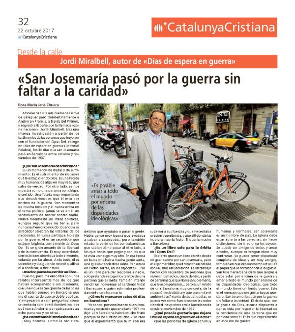 A finales de 1937 san Josemaría Escrivá de Balaguer pasó clandestinamente a Andorra y Francia, a través del Pirineo, y regresó a España por la llamada «zona nacional». Jordi Miralbell, tras una intensa investigación a partir de los testimonios de las personas que huyeron con el fundador del Opus Dei, recoge en Días de espera en guerra (Editorial Palabra), los 40 días que san Josemaría pasó en Barcelona entre octubre y noviembre de 1937.