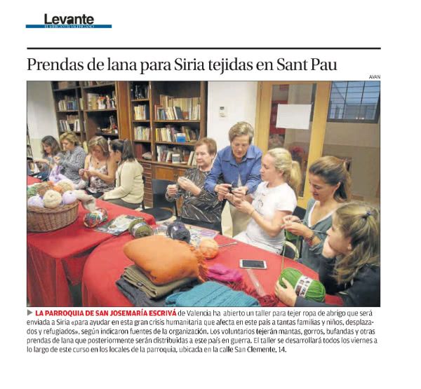 Un grupo de voluntarios se reunirá cada viernes, desde esta misma semana, para prestar ayuda a los refugiados sirios. La parroquia de San Josemaría Escrivá de Valencia ha abierto un taller para tejer ropa de abrigo que será enviada a Siria “para ayudar en esta gran crisis humanitaria que afecta en este país a tantasfamilias y niños, desplazados y refugiados”, según han indicado hoy a la agencia AVAN fuentes de la organización.