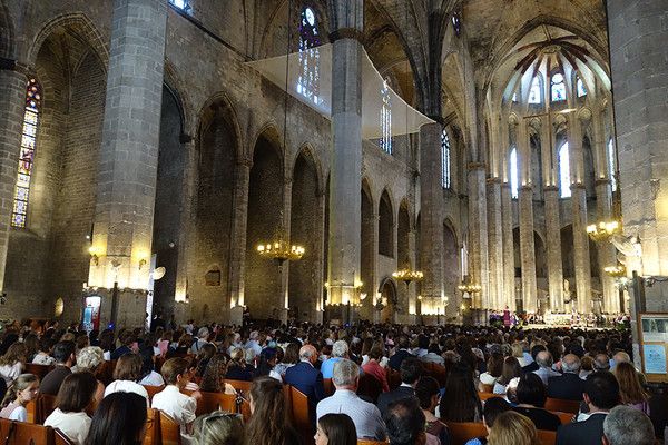 La luz filtrada a través de las vidrieras y rosetones llenaba el templo de una atmósfera apacible, en la que cientos de personas seguían la ceremonia cantando, rezando o llorando según los casos. Sonriendo también, cuando el sacerdote Manuel Cardona, hermano de Teresa y encargado de celebrar la Eucaristía, leyó en voz alta una carta enviada por ella para felicitarle el cumpleaños cuando tenía 17 años. O cuando el vicario del Opus Dei en Barcelona, Ignacio Font, recordó en la homilía algunos trazos de su modo de ser tras una pequeña encuesta efectuada a sus amigas, compañeras y alumnas.